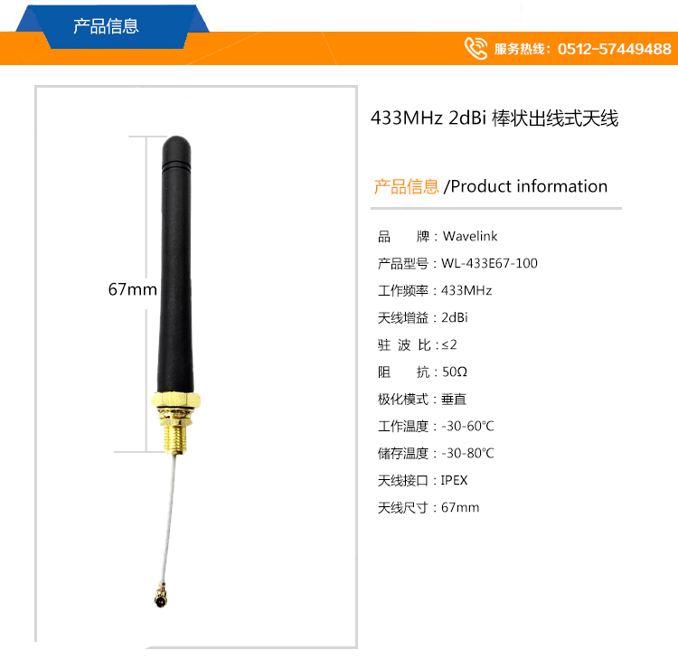 NB-IOT天線 433MHz 2dBi 棒狀出線式天線 67mm IPEX接頭