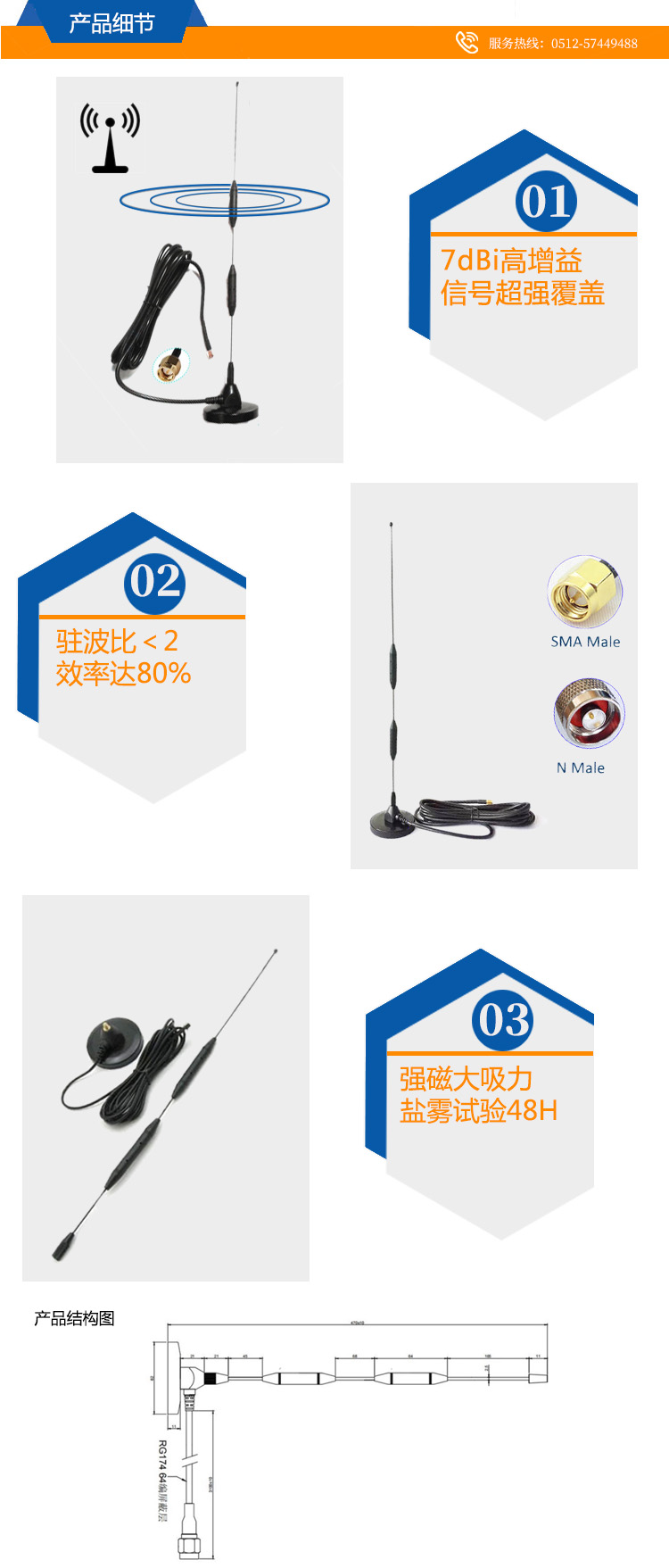 頻率范圍:900/1800/2100MHz|增益:7dbi |阻抗:50Ω| VSWR≤2 |天線類型:磁性安裝|極化:垂直|全向